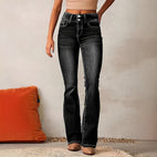 Diese Schlaghose kombiniert eine hohe Taille mit einem modischen, weiten Bein. Das robuste Material sorgt für Komfort und Beständigkeit, während der Schnitt die Beine länger wirken lässt und die Taille betont. Vielseitig mit legeren T-Shirts oder eleganten Oberteilen zu kombinieren. Ein Muss für Frauen, die sowohl Stil als auch Bequemlichkeit schätzen.