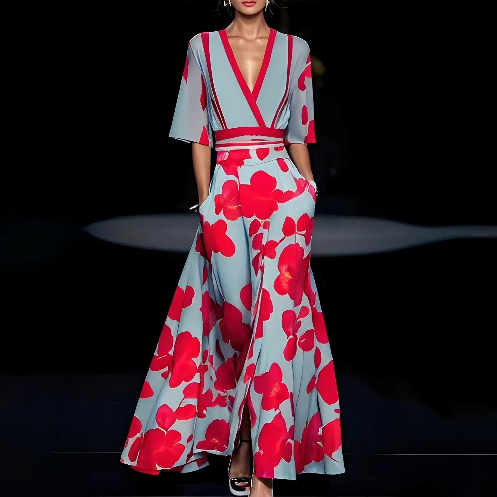 Ziehen Sie mühelos alle Blicke auf sich mit dem eleganten langen Blumenkleid Débora, das Komfort, Stil und Eleganz perfekt vereint.
