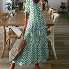 Entdecken Sie den wahren Charme dieses eleganten, langen Boho-Kleides, das aus einem weichen und atmungsaktiven Stoff gefertigt ist und Ihnen den ganzen Tag über optimalen Komfort bietet. Sein romantischer V-Ausschnitt und die anmutige Silhouette verleihen ihm einen femininen und freien Touch, perfekt für lässige Ausflüge ebenso wie für besondere Anlässe. Mit seinem fließenden Fall und der leichten Textur betont es alle Körperformen. Sein lässiger, aber raffinierter Stil macht es zur idealen Wahl für diejenigen, die den Boho-Chic mit einem Hauch von Raffinesse lieben. Kombinieren Sie es mit Sandalen für einen lässigen Look oder kleiden Sie es mit Absätzen und Accessoires für einen Abend auf.