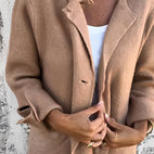 Der lange Strickmantel „Izabelle“ fällt durch sein gemütliches Material auf und hat einen lässigen, luftigen Stil, der Bewegungsfreiheit ermöglicht. Sein schlichter, moderner Look passt zu vielen Anlässen – ideal für den Alltag, das Büro oder entspannte Freizeit. Ein stilvoller Begleiter, der Wärme mit Eleganz kombiniert.