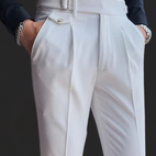 Diese Hosen bringen britisch inspirierte Schneiderkunst in eine zeitgemäße Silhouette. Gefertigt aus leichtem, atmungsaktivem Stoff sind sie perfekt für Frühling und Sommer. Das plissierte Vorderteil und der verstellbare Kummerbund verleihen eine markante Passform, während der entspannte obere Teil und das konisch zulaufende Bein Eleganz und Komfort vereinen. Ob mit Hemd oder T-Shirt – sie ergänzen jeden Look mit müheloser Raffinesse.